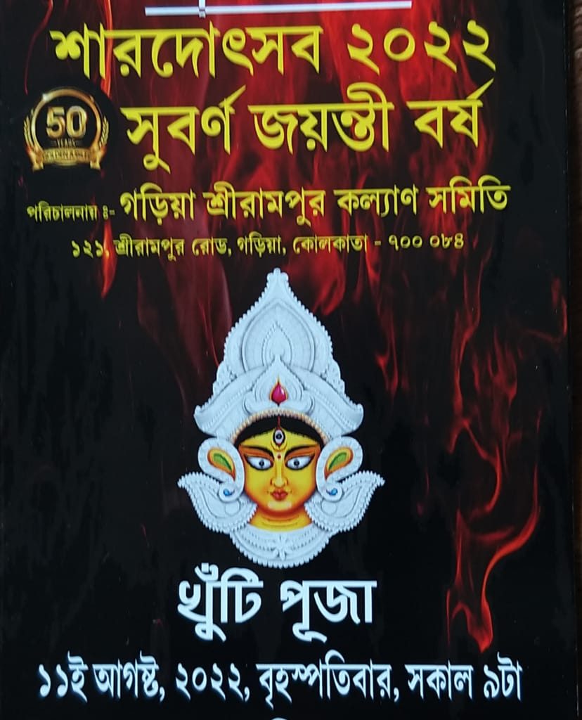 খুঁটি পূজা, শারদোৎসব ২০২২, সুবর্ণ জয়ন্তী বর্ষ August 4, 2022 CulturalPast EventsVisible আমন্ত্রণ পত্র এই বছর, সমিতির সুবর্ণ জয়ন্তী বর্ষের শারদোৎসব উপলক্ষে আগামী ১১ই আগস্ট ২০২২, বৃহস্পতিবার সকাল ৯-টায় খুঁটি পূজার আয়োজন করা হয়েছে। আপনাদের সকলের উপস্থিতি একন্ত কাম্য। ধন্যবাদান্তে গড়িয়া শ্রীরামপুর কল্যান সমিতি কতৃপক্ষ্য Previous Post Notice of conveying information through Club’s WhatsApp Group Next Post Semi-Contract Auction Bridge Competition, 2022